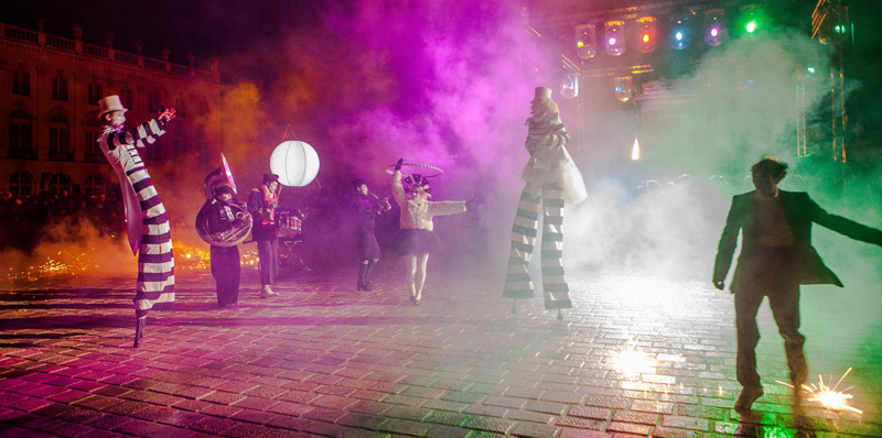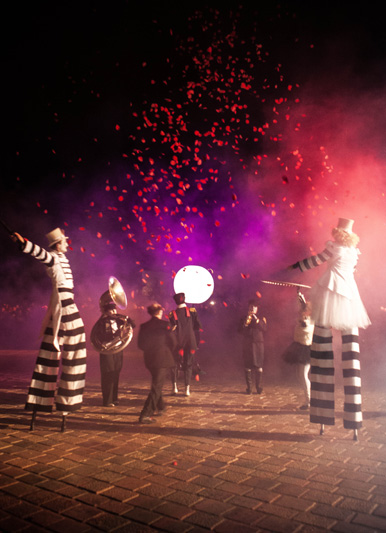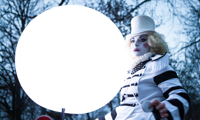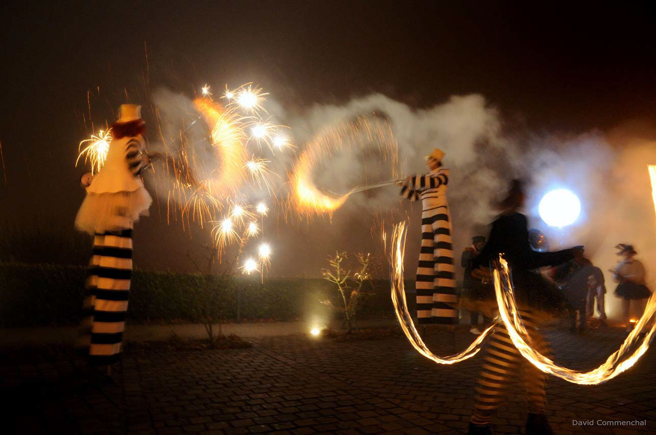 Deux échassiers quelques peu débutants, une acrobate qui voudrait grimper sur la lune, portée par les échassiers ;