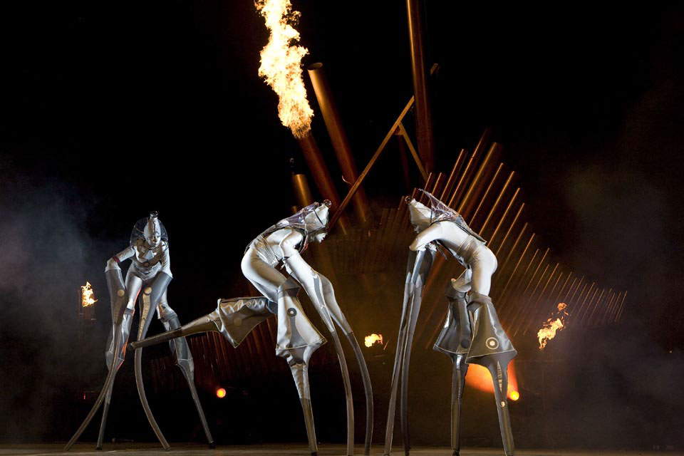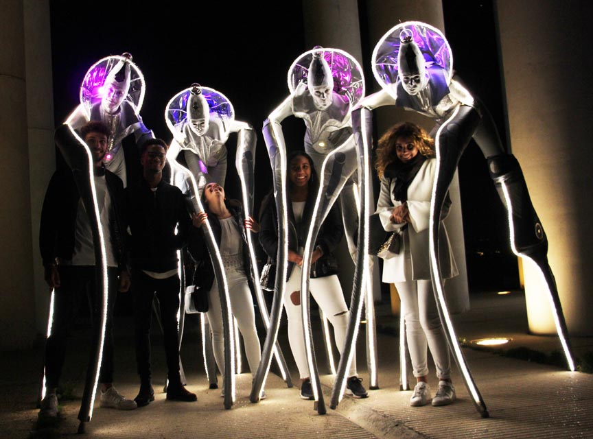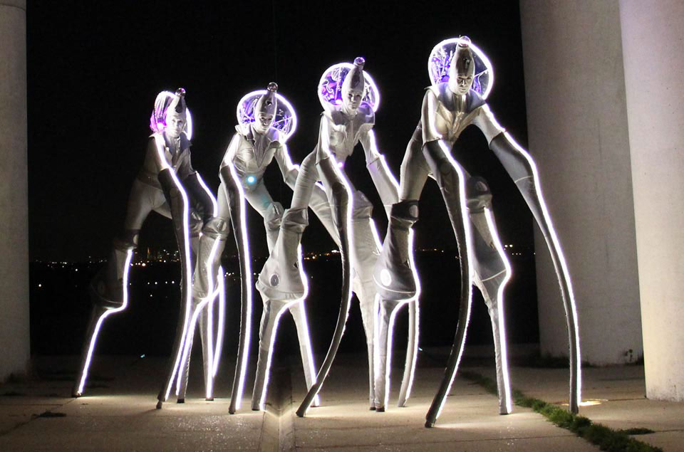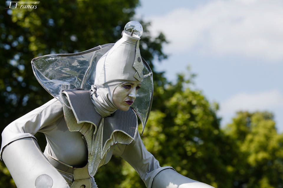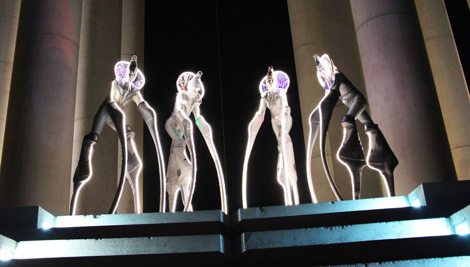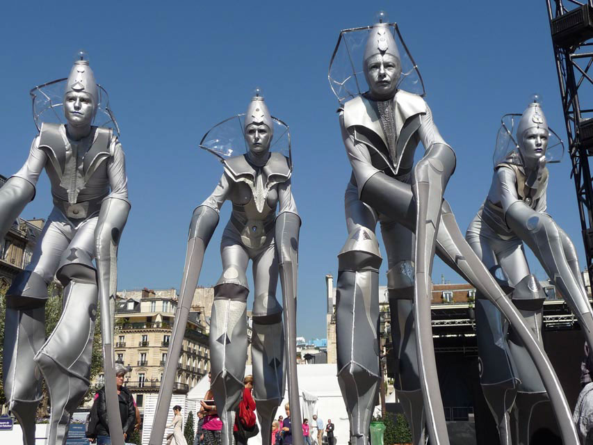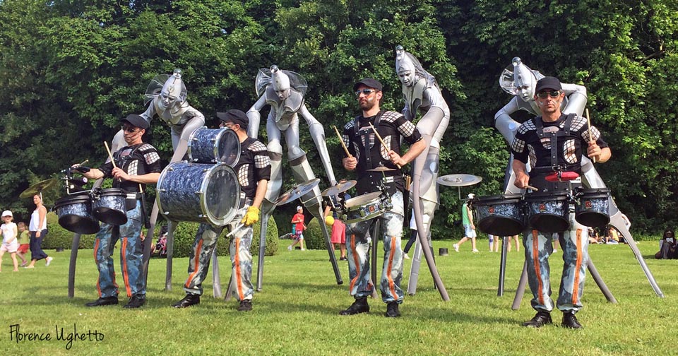 « Les Cosmopodes » se produisent également avec les « Percussionnautes », ces bateleurs du futur en costumes cosmiques apportent ainsi aux aventure terriennes des Cosmopodes un univers musical hors norme, qui les feront entrer