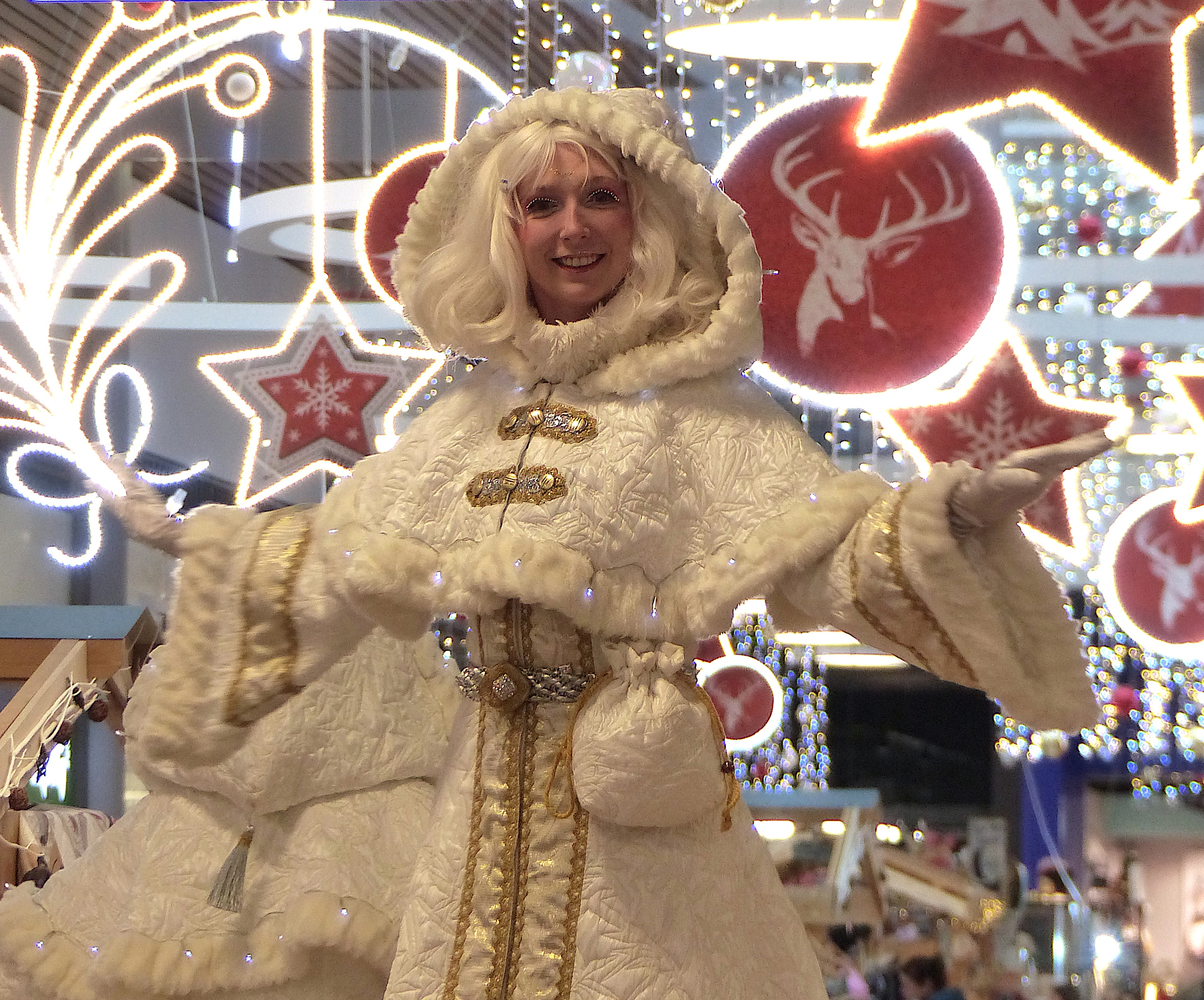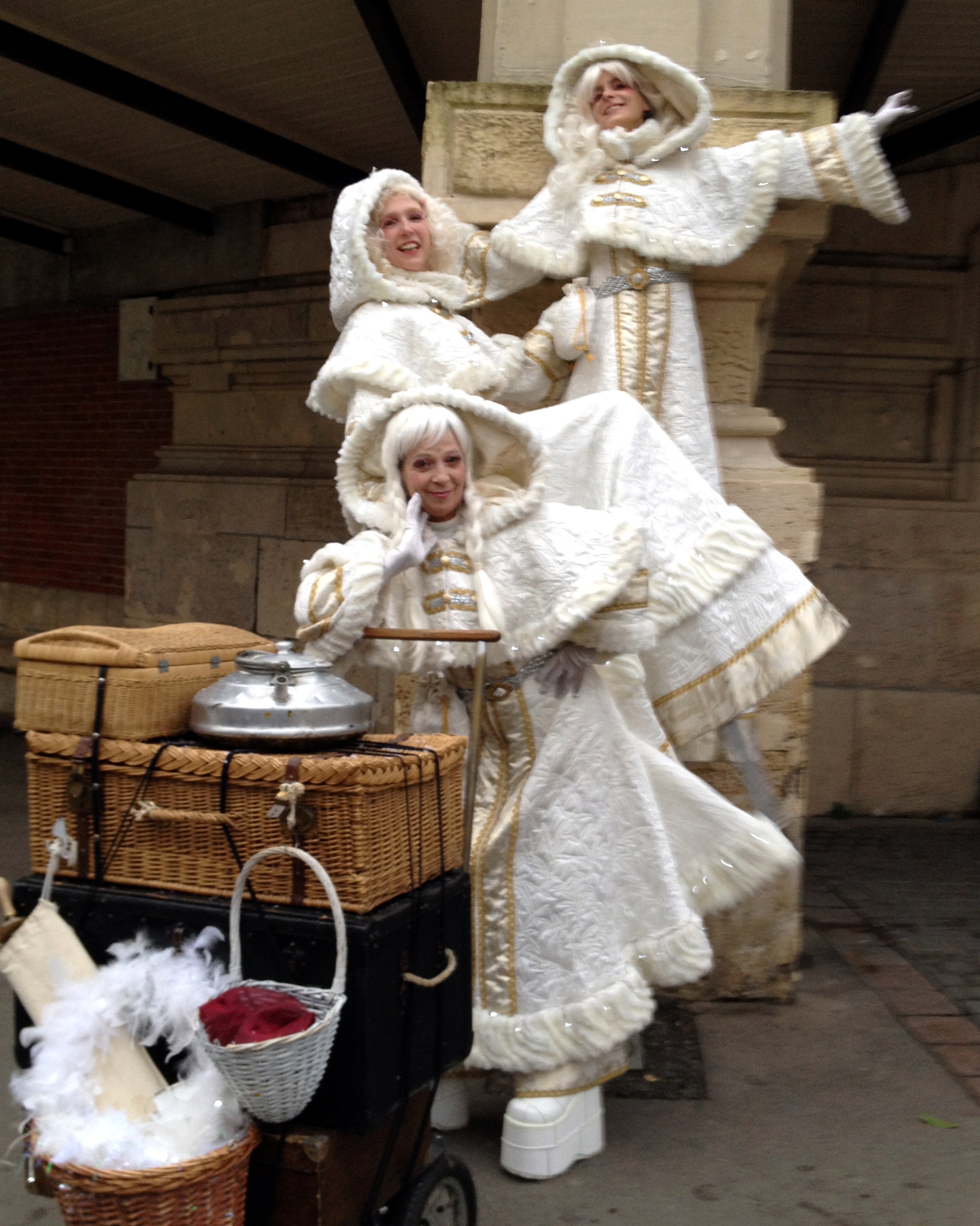 Trois comédiennes, de taille différente (cothurnes, échasses de 60 cm et de 1 m), emmitouflées dans leurs manteaux de neige, d’or et d’argent, parsemés de lucioles (leds lumineux).