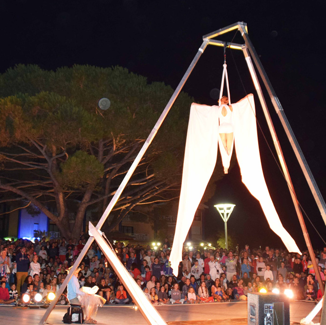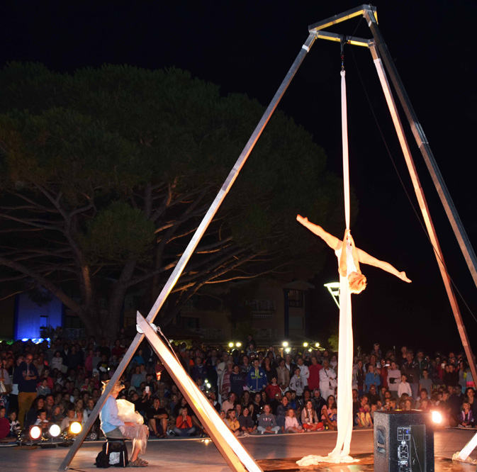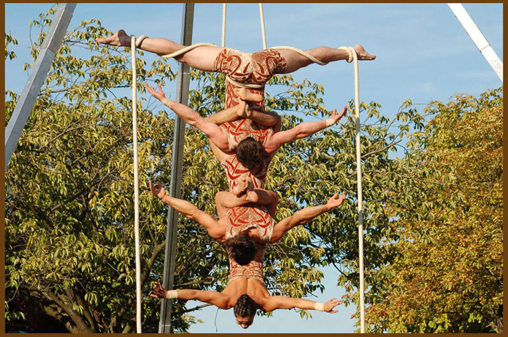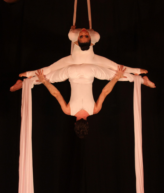 Les artistes se hissent, s’enroulent, se lâchent, s’accrochent, se suspendent les uns aux autres et au tissu.