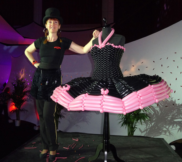Elle confectionne pendant la durée de votre cocktail, salon ou événement une robe en ballons