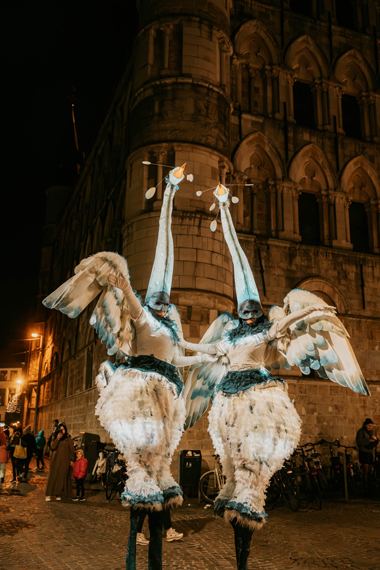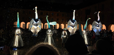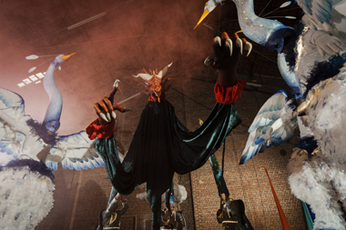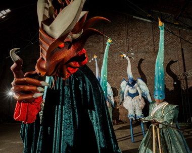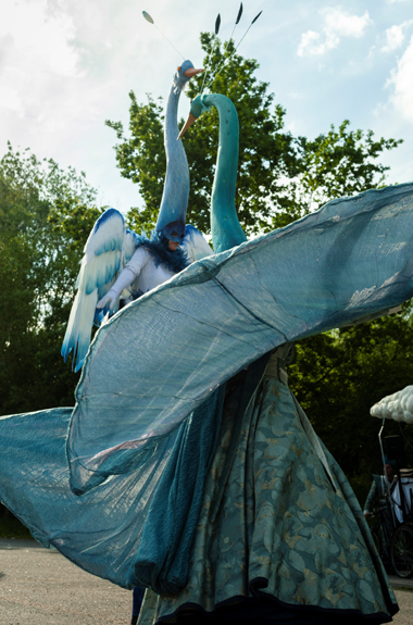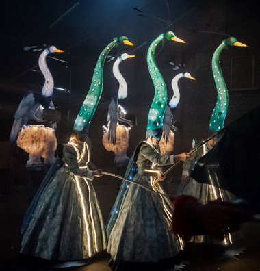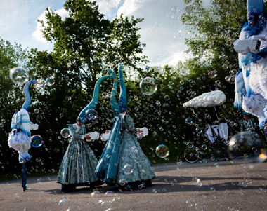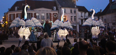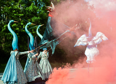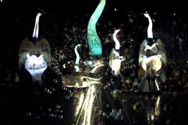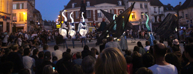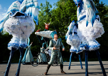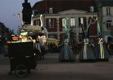 Spectacle fixe et/ou déambulatoire, pour 7 comédiens, un pousse-pousse sonorisé et une marionnette géante, avec effets visuels (costumes lumineux, drapeaux géants, artifices de proximité, fumée, nuage de bulles de savon), enrobé d’un univers musical avec voix off narratrice.