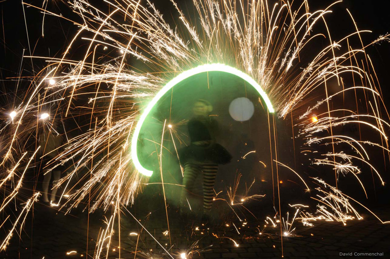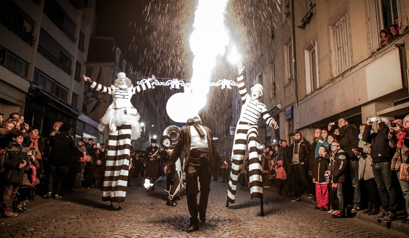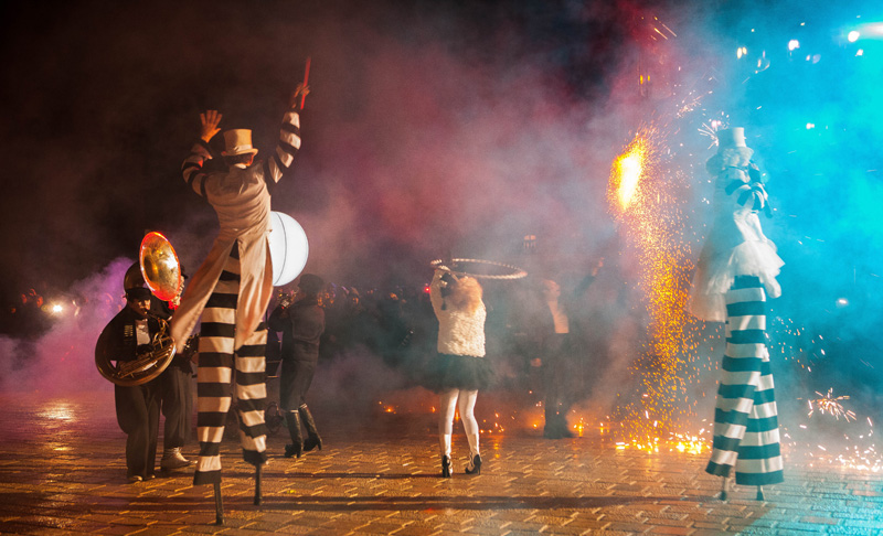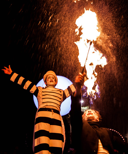 Deux échassiers quelques peu débutants, une acrobate qui voudrait grimper sur la lune, portée par les échassiers ;