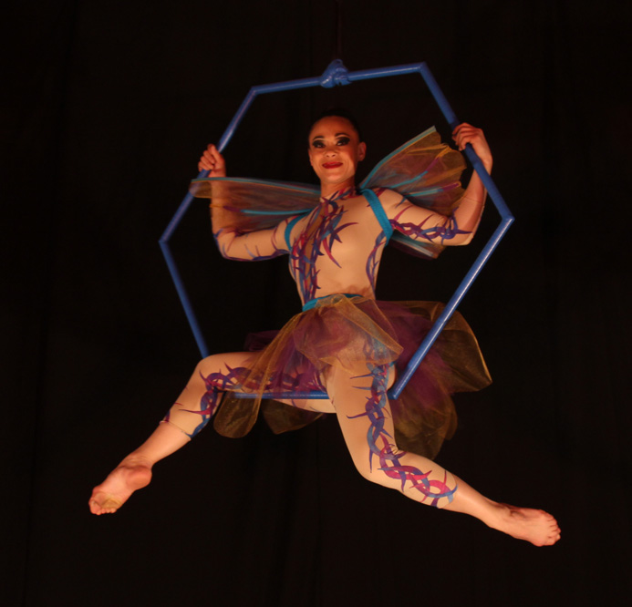 Adagio (mains à mains), trapèze triangulaire, tissu aérien en solo et duo, jongleries, équilibre sur cannes et fil mou,
