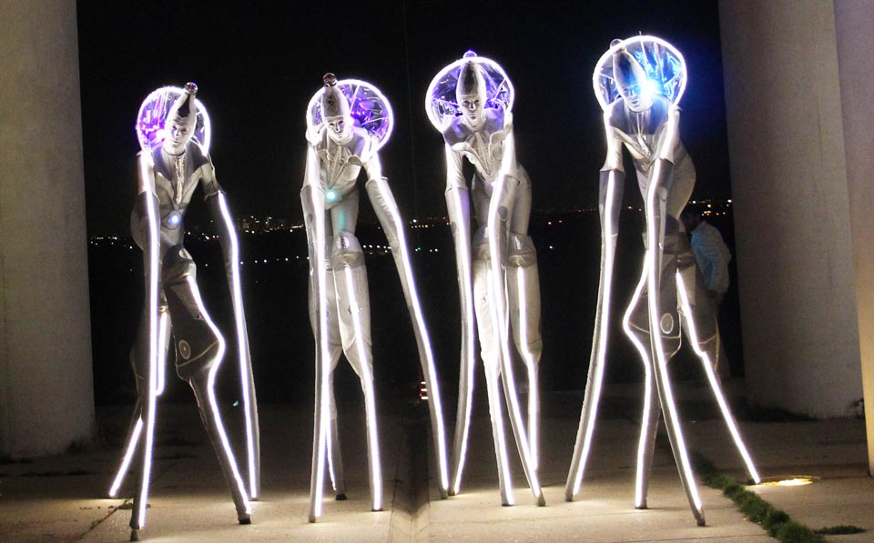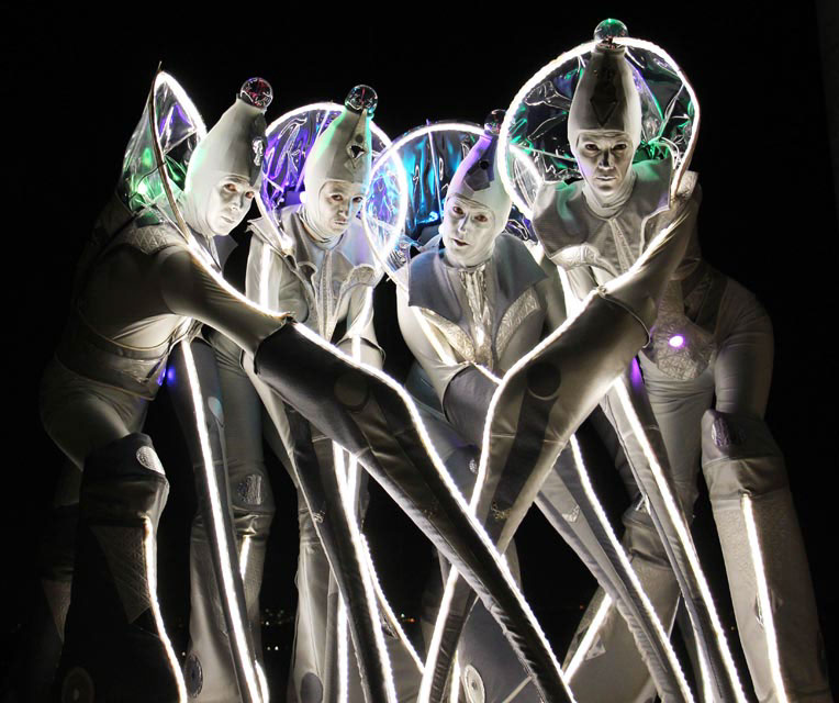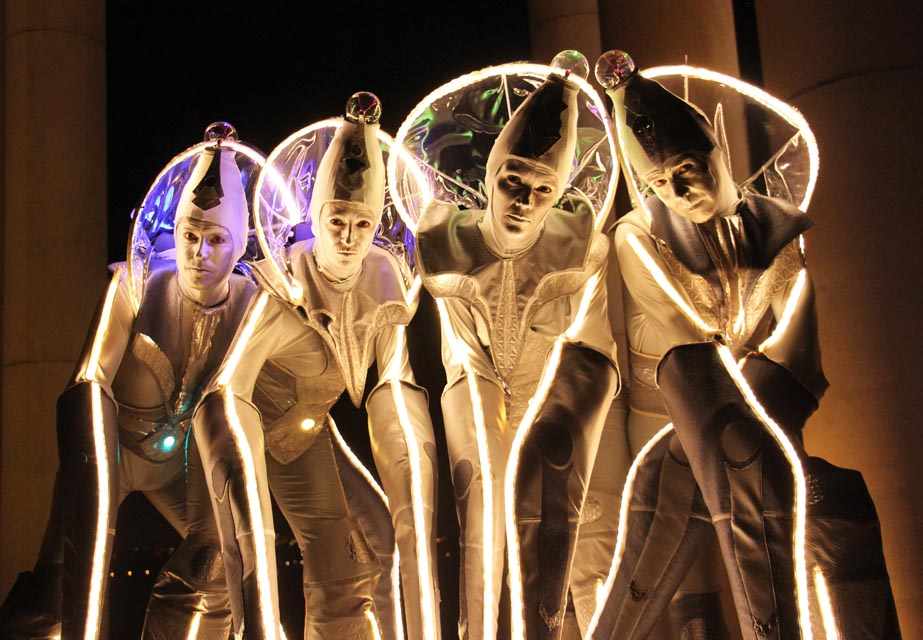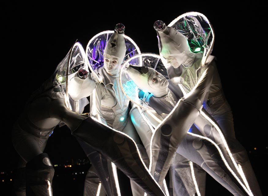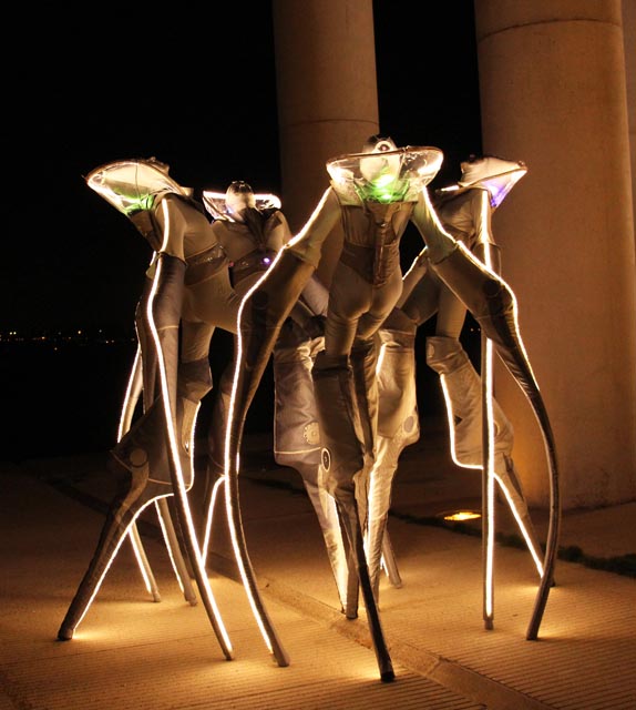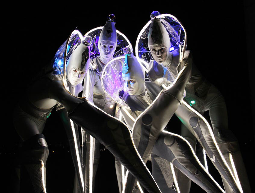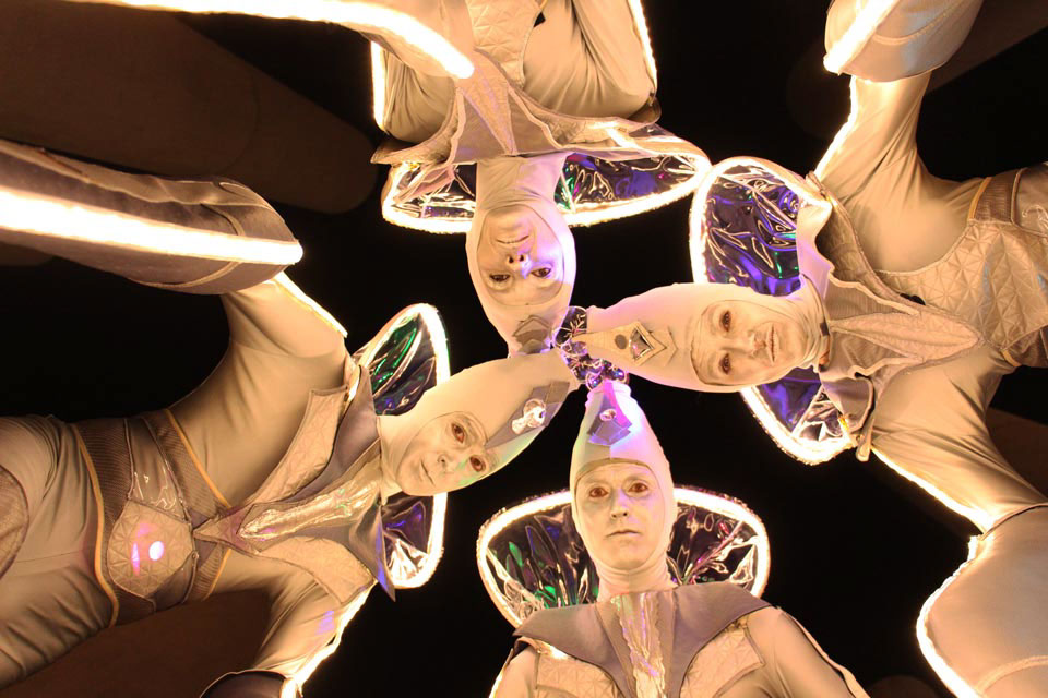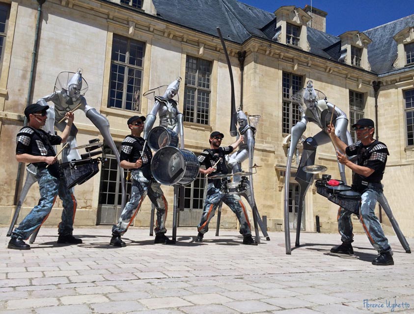 « Les Cosmopodes » se produisent également avec les « Percussionnautes », ces bateleurs du futur en costumes cosmiques apportent ainsi aux aventure terriennes des Cosmopodes un univers musical hors norme, qui les feront entrer