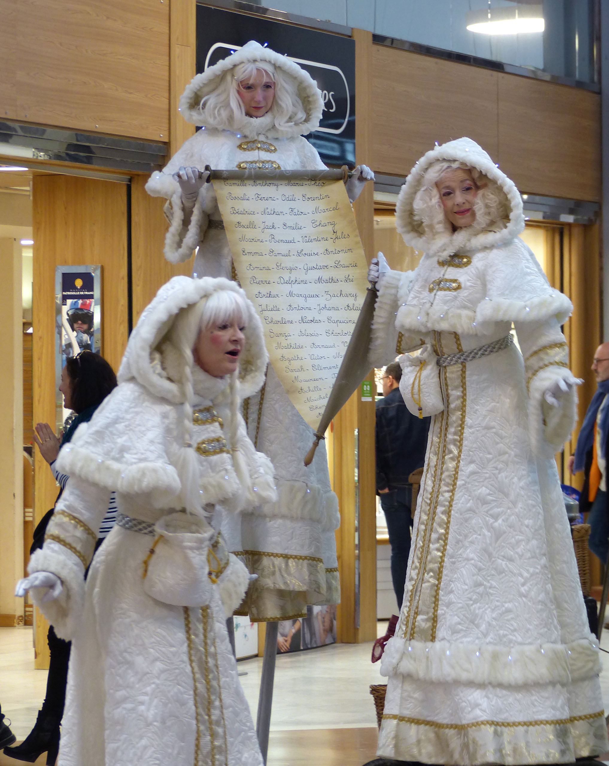 Trois comédiennes, de taille différente (cothurnes, échasses de 60 cm et de 1 m), emmitouflées dans leurs manteaux de neige, d’or et d’argent, parsemés de lucioles (leds lumineux).