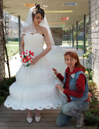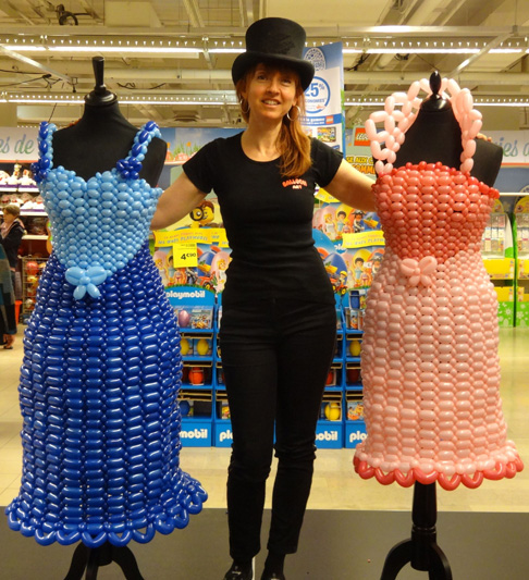 Elle confectionne pendant la durée de votre cocktail, salon ou événement une robe en ballons
