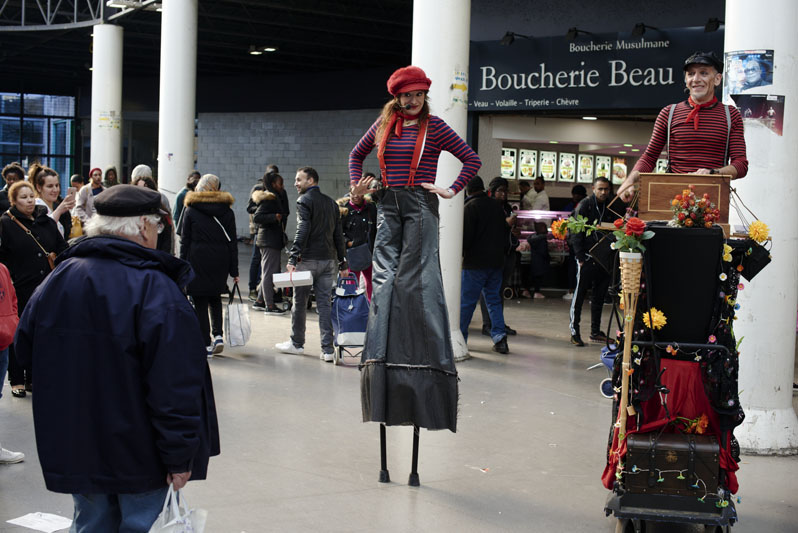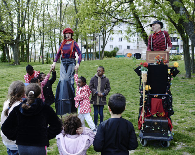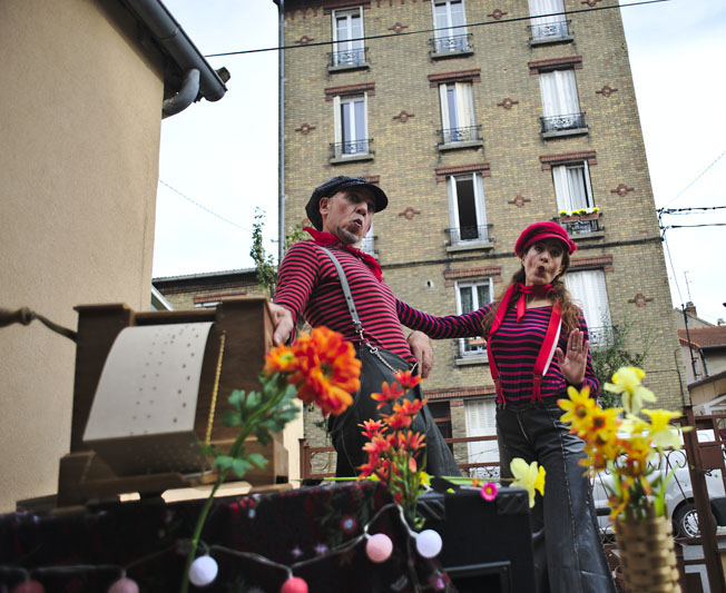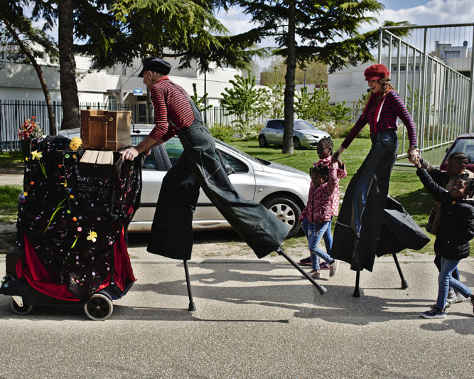 Tour de chant déambulatoire sur échasses avec orgue de barbarie