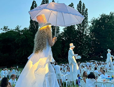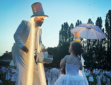 Les derniers invités s’annoncent. Leurs costumes de rêves, blancs et lumineux éclatent dans la pénombre du début de soirée. Ils ajustent leurs costumes, vérifient leurs chapeaux,  puis endossent la nuit sur leurs épaules avant d'entrer dans la danse. Ils retrouvent leurs semblables, se saluent délicatement, inclinent la tête de côté avec grâce, conversent à voix feutrée : le bal peut commencer.