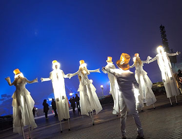 Spectacle fixe et/ou déambulatoire, pour 7 ou 5 personnages et un triporteur sonorisé. Avec effets visuels (costumes lumineux, fumée, nuage de bulles de savon), enrobé d’un univers musical.