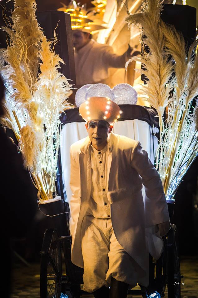 Spectacle fixe et/ou déambulatoire, pour 5 personnage et un pousse-pousse sonorisé. Avec effets visuels (costumes lumineux, fumée, nuage de bulles de savon), enrobé d’un univers musical.