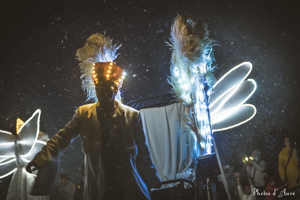Spectacle fixe et/ou déambulatoire, pour 5 personnage et un pousse-pousse sonorisé. Avec effets visuels (costumes lumineux, fumée, nuage de bulles de savon), enrobé d’un univers musical.