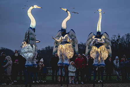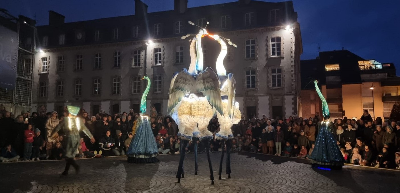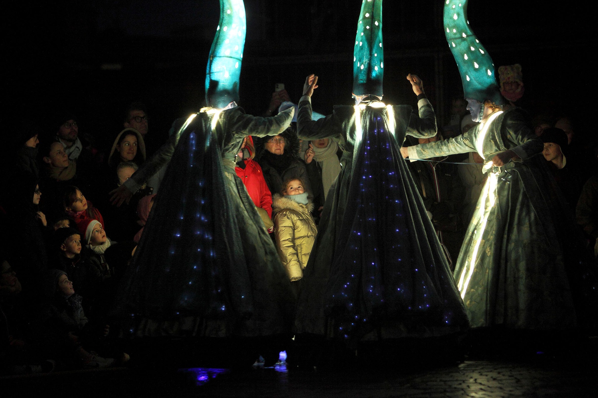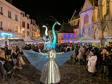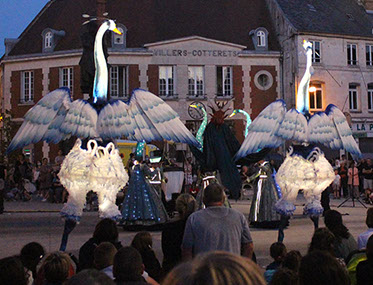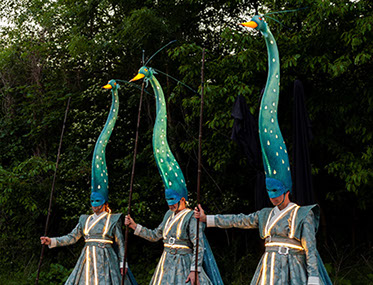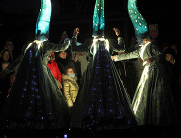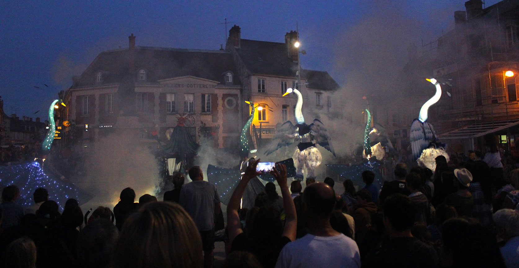 Spectacle fixe et/ou déambulatoire, pour 7 comédiens, un pousse-pousse sonorisé et une marionnette géante, avec effets visuels (costumes lumineux, drapeaux géants, artifices de proximité, fumée, nuage de bulles de savon), enrobé d’un univers musical avec voix off narratrice.