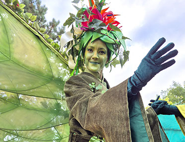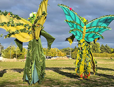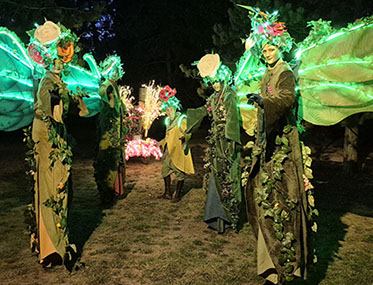 Imposants et élégants, drapés de feuillages, et de fleurs, ces elfes géants avancent lentement, tels des esprits ancestraux sortis de la nature profonde. Leur regard traverse les âges, leur présence impose le respect : ils ne parlent pas, mais tout en eux raconte l'histoire de la planète. Dans un ballet aérien, entre grâce et puissance ils avancent au rythme du vent, caressent le ciel et émerveillent petits et grands. Ces êtres, telles les lucioles, s'illuminent à la nuit tombée, offrent un moment suspendu, un pas de côté dans un monde imaginaire.
